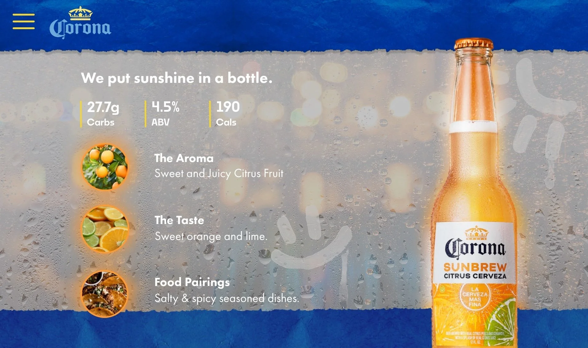 To pair with this campaign, I designed UI for a product page in Adobe XD to show the campaign applied in a more comprehensive medium. The site visually reflects elements of the campaign as well as Corona’s current brand website. It is designed to be responsive to mobile, tablet, and desktop screens, with images and text properly resized.