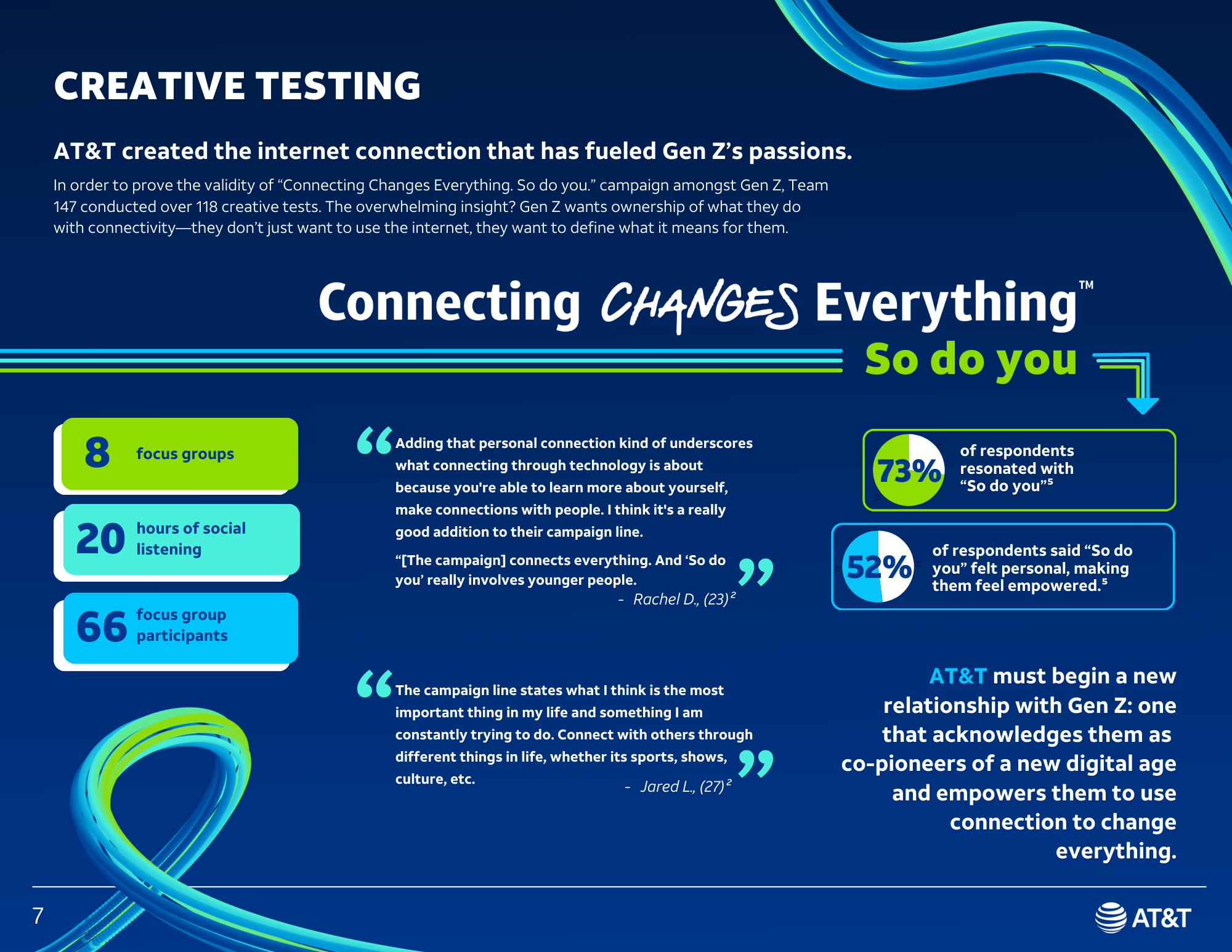 Our campaign reframes AT&T from just another bill to pay into a “possibilities provider,” who’s high speed internet enables Gen Z to accomplish “everything.” Similarly to how AT&T pioneered telecommunications, Gen Z is pioneering the digital age, and AT&T needs to be prepared to help them tackle everything that comes with it. To make the message more personal, we evolved AT&T’s “Connecting Changes Everything” line by coupling it with “So do you,” recentering the campaign around Gen Z, not AT&T.